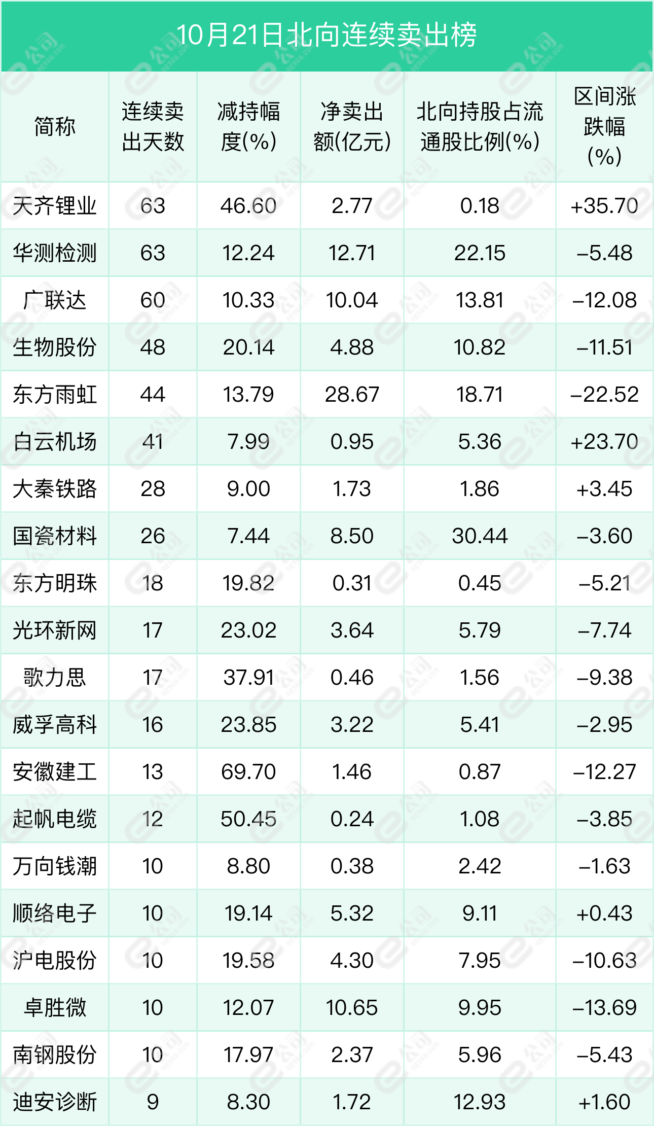 天齐锂业、华测检测、广联达遭北向资金连续净卖出天数居前,分别为63天、63天、60天,期间净卖出额分别为2.77亿元、12.71亿元、10.04亿元,期间减持幅度分别为46.6%、12.24%、10.33%。