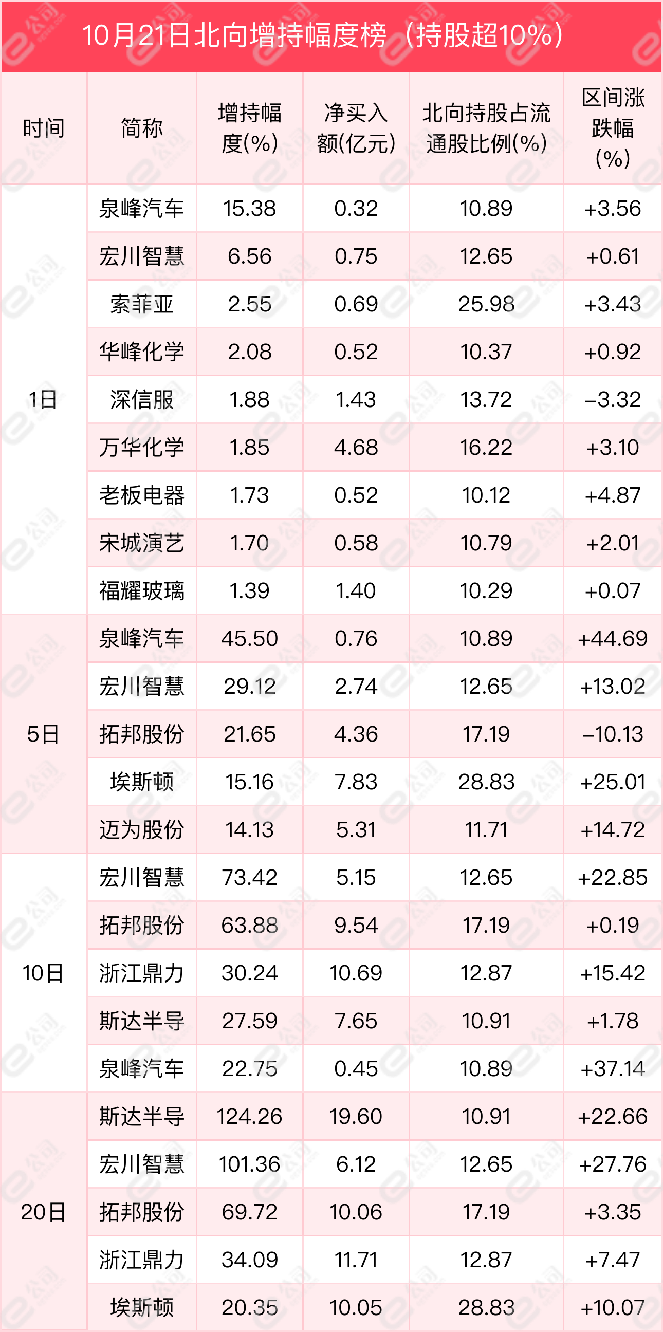 从增减持幅度来看,北向资金持股占流通股比例超10%的个股中,泉峰汽车、宏川智慧、索菲亚获北向资金增持幅度居前,分别为15.38%、6.56%、2.55%。