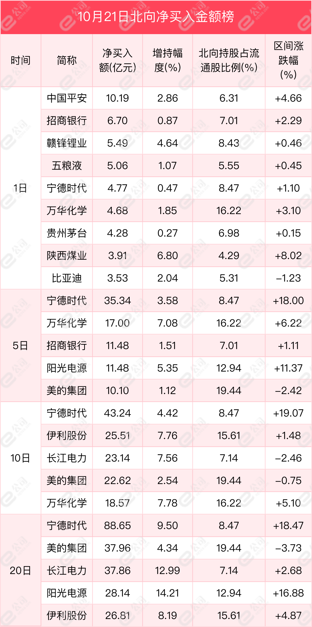 数据统计显示,10月21日北向资金单日净买入101.54亿元,其中沪股通净买入57.08亿元,深股通净买入44.46亿元。北向资金成交金额1038.50亿元,占A股总成交额10.55%,交易活跃度上升1.91%,其中沪股通买入金额277.13亿元,卖出金额220.05亿元,深股通买入金额292.89亿元,卖出金额248.43亿元。