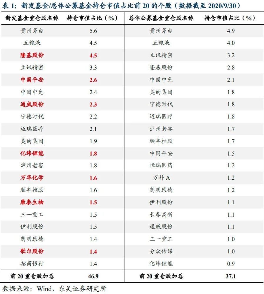 整体来看,新发基金持股集中度更高。新发基金持有的前20重仓股占基金资产净值比例 46.9%,相对于总体公募的37.1%大幅提升。