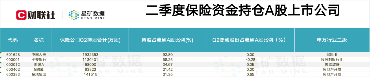 进一步来看,根据险资二季度持股占流通股比例超过30%的A股上市公司包括中国人寿、平安银行、南玻A、金融街和金地集团。