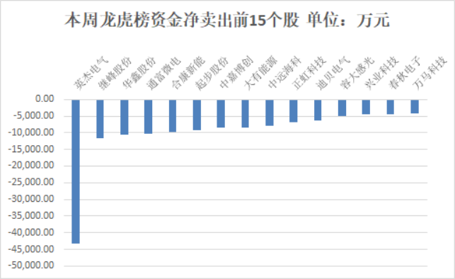 个股龙虎榜净卖出金额居前的15只个股分别为: