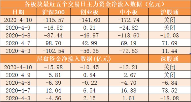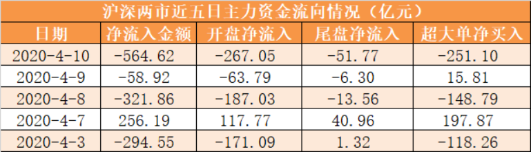 本周两市主力资金累计净流出689.21 亿元。其中周五(4月10日)主力资金开盘净流出267.05亿元,尾盘净流出51.77亿元,全天净流出564.62亿元。