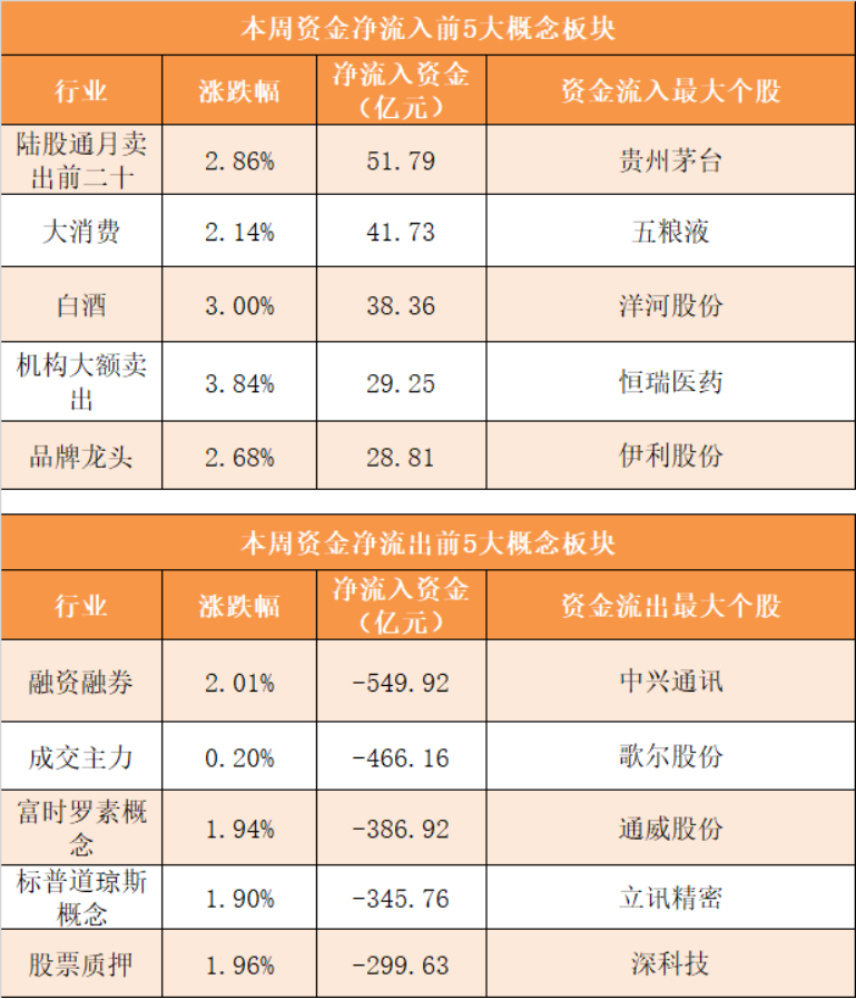 概念板块方面,本周陆股通月卖出前二十、大消费、白酒等概念板块资金呈现净流入,其中陆股通月卖出前二十概念净流入51.79亿元居首。