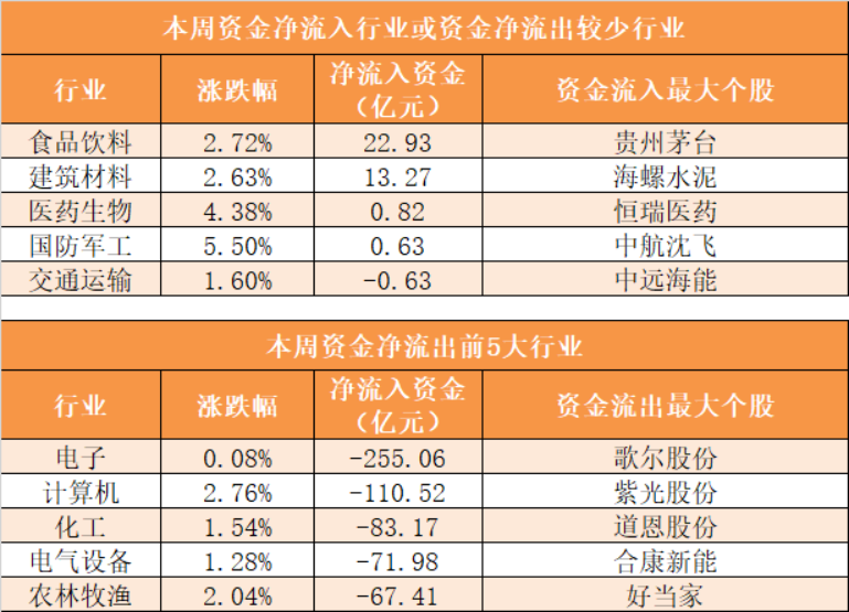 28个申万一级行业中,本周4个行业实现资金净流入,其中食品饮料行业净流入22.93亿元居首。