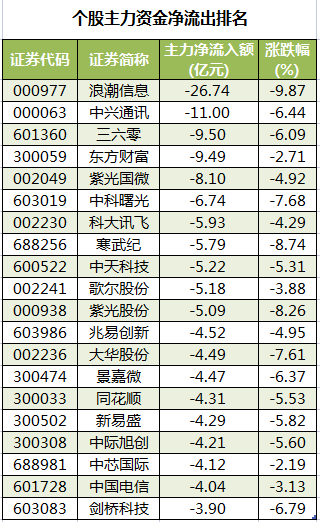 此外,3156只个股被主力资金净卖出,其中,127股被主力资金净卖出超1亿元。主力资金净流出最多的个股是浪潮信息,净流出金额为26.74亿元;主力资金净流出居前的个股还有中兴通讯、三六零、东方财富、紫光国微、中科曙光,净流出金额分别为11亿元、9.5亿元、9.49亿元、8.1亿元、6.74亿元。