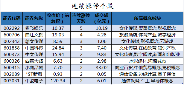 从收盘涨停板封单量来看,*ST新海最受追捧,收盘涨停板封单有1859.56万股;其次是搜于特、物产中大,涨停板封单分别有1716.47万股、1703.07万股。以封单金额计算,吉宏股份、奥飞娱乐、中国科传等涨停板封单资金较多,分别有1.9亿元、1.33亿元、1.09亿元。