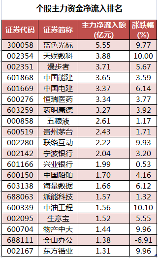 个股来看,今日有1794只个股获主力资金净流入,其中,32股获主力资金净流入超1亿元。蓝色光标获主力资金净流入最多,净流入金额为5.55亿元;主力资金净流入居前的个股还有天娱数科、漫步者、中国能建、中国电建、恒瑞医药,净流入金额分别为3.88亿元、3.71亿元、3.65亿元、3.37亿元、3.34亿元。