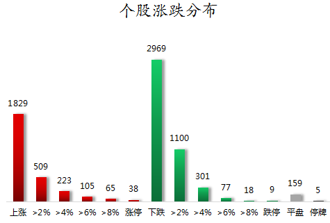 截至收盘,沪深两市合计1829只个股上涨,2969只个股下跌,平盘个股159只,停牌的个股5只。不含当日上市新股,共有38只个股涨停,9只个股跌停。连续涨停天数看,奥飞娱乐已连收5个涨停板,连续涨停板数量最多。