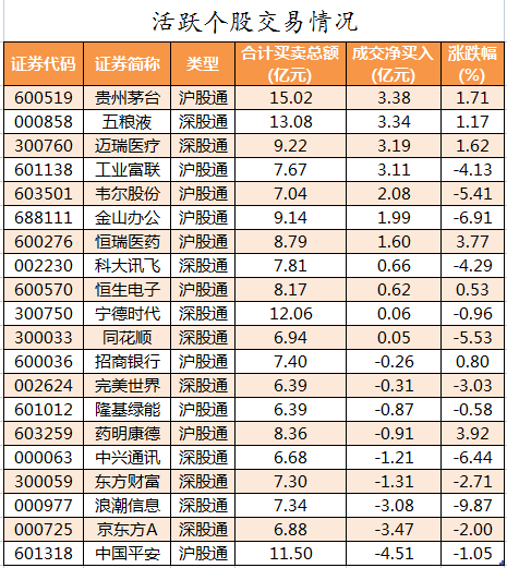 活跃个股方面,北向资金今日净买入较多的有贵州茅台、五粮液、迈瑞医疗、工业富联、韦尔股份,净买入金额分别为3.38亿元、3.34亿元、3.19亿元、3.11亿元、2.08亿元。北向资金净卖出较多的有中国平安、京东方A、浪潮信息、东方财富、中兴通讯,净卖出金额分别为4.51亿元、3.47亿元、3.08亿元、1.31亿元、1.21亿元。