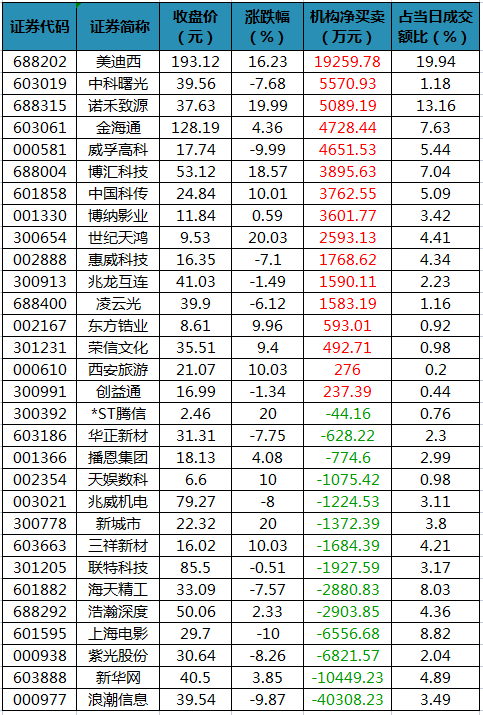盘后龙虎榜数据显示,今日机构席位资金合计净卖出约1.9亿元。其中,净买入的个股16只,净卖出的个股14只。机构净买入最多的股票是美迪西,净买入金额约1.93亿元;机构净买入居前的还有中科曙光、诺禾致源、金海通、威孚高科、博汇科技等股。机构净卖出最多的股票是浪潮信息,净卖出金额约4.03亿元;机构净卖出居前的还有新华网、紫光股份、上海电影等股。