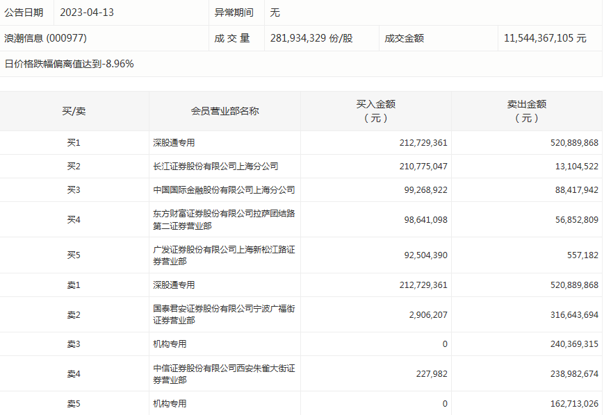 浪潮信息今天跌9.87%。盘后数据显示,2个机构出现在龙虎榜单上,合计净卖出约4.03亿元;长江证券股份有限公司上海分公司买入2.11亿元,同时卖出1310.45万元;国泰君安证券股份有限公司宁波广福街证券营业部买入290.62万元,同时卖出3.17亿元。