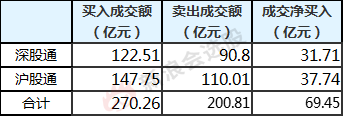 统计显示,6月11日沪指上涨2.58%,北向资金合计买入成交270.26亿元,卖出成交200.81亿元,合计成交额471.07亿元。全天成交净买入69.45亿元,其中,沪股通合计成交额257.76亿元,成交净买入37.74亿元;深股通合计成交213.31亿元,成交净买入31.71亿元。