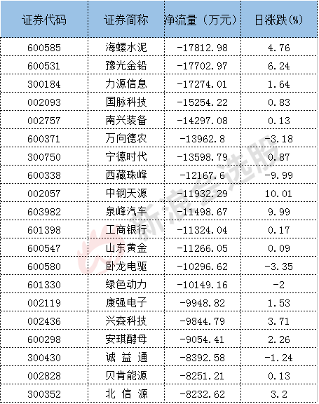 主力资金净流出个股中,海螺水泥主力资金净流出1.78亿元,净流出资金最多;其次是豫光金铅、力源信息,净流出资金分别为1.77亿元、1.73亿元。