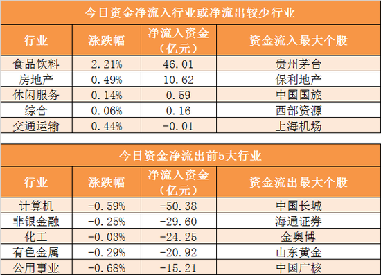 28个申万一级行业中,4个行业实现资金净流入,其中食品饮料行业净流入46.01亿元居首。