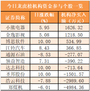 盘后龙虎榜数据显示,机构现身10股,其中小熊电器等4股呈现机构资金净买入,郑煤机等6股呈现机构资金净卖出。