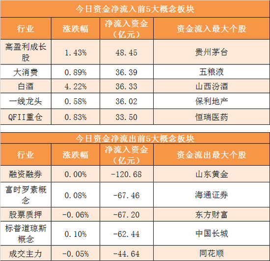 概念板块方面,今日高盈利成长股、大消费、白酒、一线龙头等概念板块资金呈现净流入,其中高盈利成长股概念净流入48.45亿元居首。