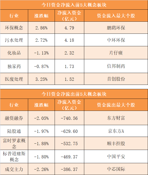 概念板块方面,今日环保概念、污水处理、化妆品、独家药等概念板块资金呈现净流入,其中环保概念净流入4.79亿元居首。