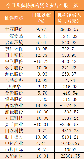 盘后龙虎榜数据显示,机构现身21股,其中世茂股份等8股呈现机构资金净买入,风华高科等13股呈现机构资金净卖出。