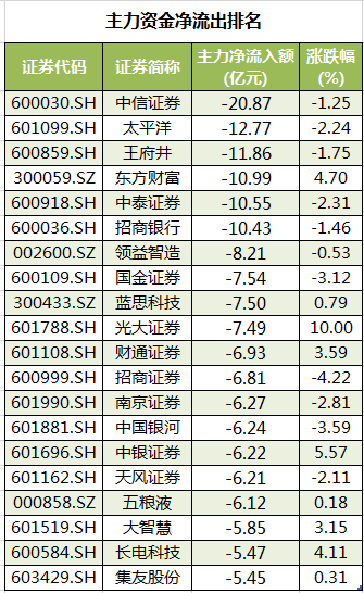 此外,174股被主力资金净卖出逾亿元。其中,中信证券、太平洋、王府井、东方财富、中泰证券主力资金净流出较多,净流出金额分别为20.87亿元、12.77亿元、11.86亿元、10.99亿元、10.55亿元。