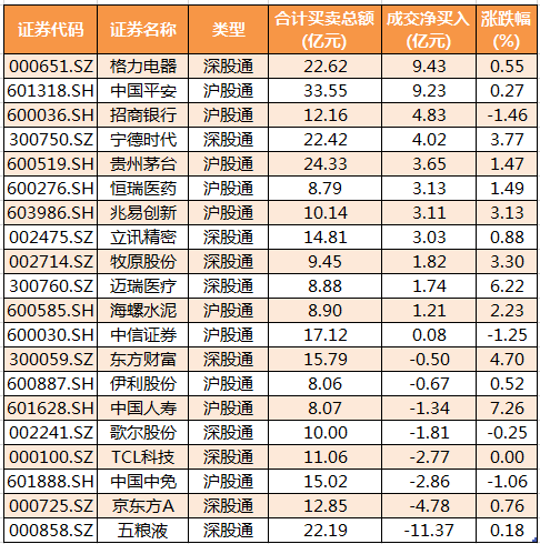 个股方面,格力电器、中国平安、招商银行、宁德时代、贵州茅台北向资金净买入金额居前,净买入金额分别为9.43亿元、9.23亿元、4.83亿元、4.02亿元、3.65亿元;五粮液、京东方A、中国中免、TCL科技、歌尔股份北向资金净卖出较多,净卖出金额分别为11.37亿元、4.78亿元、2.86亿元、2.77亿元、1.81亿元。
