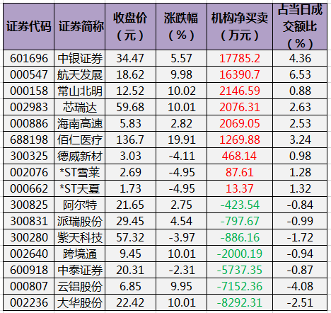 盘后龙虎榜数据显示,机构席位资金净买入1.7亿元,其中,净买入的个股9只,净卖出的个股7只。机构净买入最多的股票是中银证券,净买入金额为17785.2万元;机构净卖出最多的股票是大华股份,净卖出金额为8292.31万元。