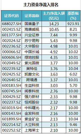 具体到个股来看,65股主力资金净流入超亿元。其中,国盾量子、海康威视、兴业证券、苏宁易购、大华股份主力资金净流入居前,净流入金额分别为14.23亿元、10.45亿元、7.44亿元、5.43亿元、4.98亿元。