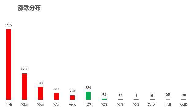 截至收盘,沪深两市合计3408只个股上涨,389只个股下跌。包括ST股在内,共有228只个股涨停,6只个股跌停。