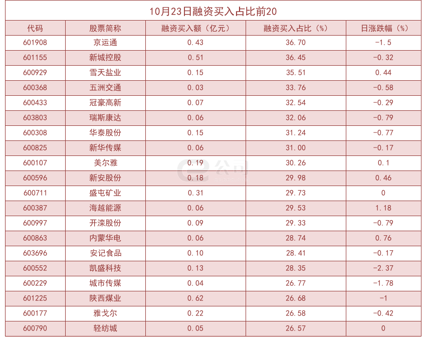 个股方面,沪深两市共有987只个股有融资资金买入。从融资买入额占当日总成交金额比重来看,共有55只股票融资买入额占比超20%,其中京运通(36.70%)、新城控股(36.45%)、雪天盐业(35.51%)排名前三。