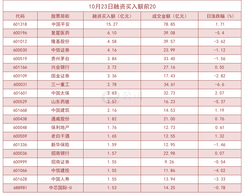 从融资资金买入金额来看,共有42只个股买入金额超亿元,其中中国平安(15.27亿元)、复星医药(6.10亿元)、隆基股份(4.58亿元)居前三位。