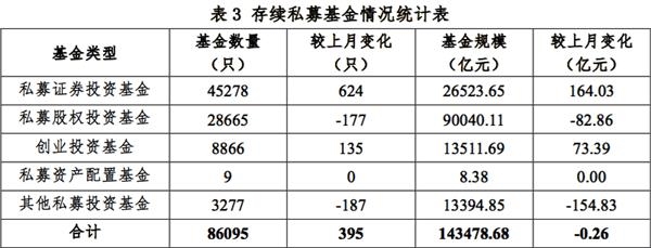 从私募基金存续情况来看,截至6月末,存续私募基金共86095只,存续规模为14.35万亿元,与上月规模基本持平。其中,存续私募证券投资基金为45278只,存续规模2.65万亿元,环比增长了164.03亿元。