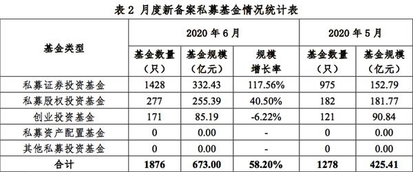 中国证券投资基金业协会的最新数据显示,6月协会新备案私募基金1876只,较上月增加598只,环比增长46.79%,新备案基金规模为673亿元,较上月增加247.6亿元,环比增长58.20%。其中,私募证券投资基金为1428只,占新备案基金数量的比重高达76.12%,新备案规模为332.43亿元,环比大涨117.56%。