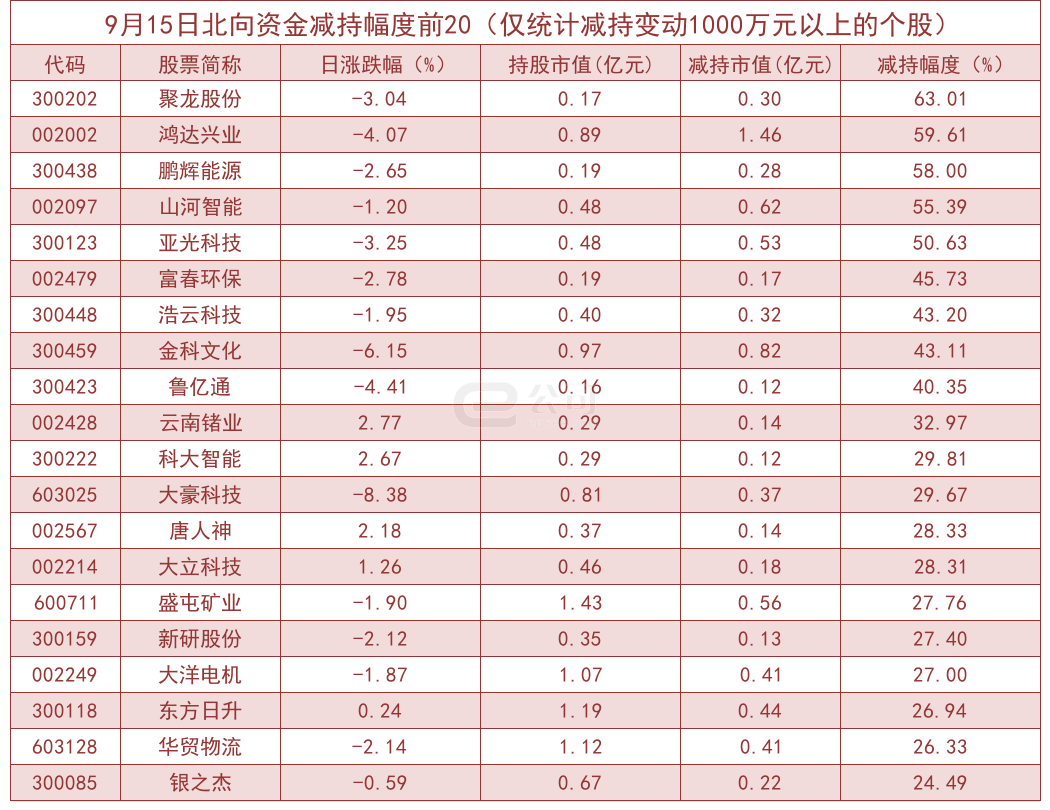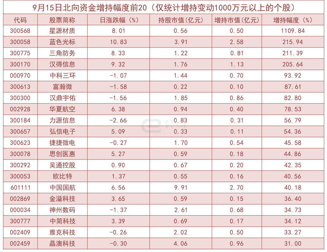 据e公司测算,增减持变动1000万元以上的个股中,星源材质、蓝色光标、三角防务、汉得信息等获北向资金大幅增持,分别为1109.84%、215.94%、211.39%、205.64%。而聚龙股份、鸿达兴业、鹏辉能源、山河智能等减持幅度较大,分别减持63.01%、59.61%、58.00%、55.39%。