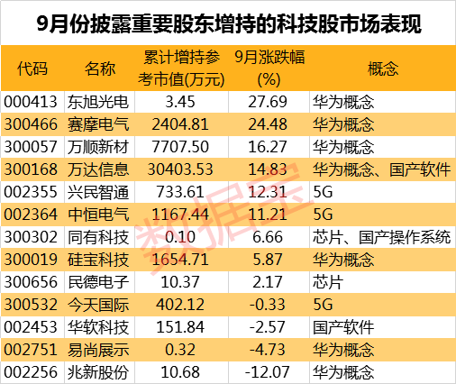 另外,梳理发现,上述111股中有13股属于科技股,合计增持市值4.47亿元。9月份以来平均上涨8%,远远跑赢大盘。其中,华为概念股东旭光电、赛摩电气、万顺新材及万达信息涨幅位居前四名,前2股9月份以来更是涨超20%;芯片股同有科技、民德电子分别上涨6.66%、2.17%。