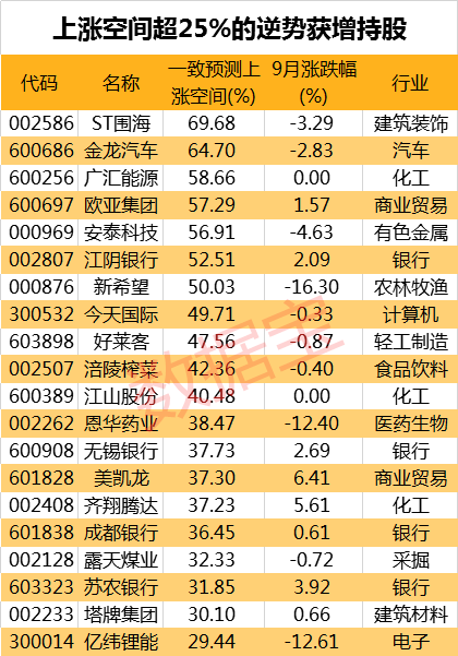 从9月份市场表现来看,上述30股中有16股跑输大盘。包括新希望、亿纬锂能、恩华药业等。其中,今天国际9月份以来获增持超400万元,股价小幅下跌0.33%,上涨空间更是接近50%。另外2只科技股易尚展示、中恒电气上涨空间也都超过10%。