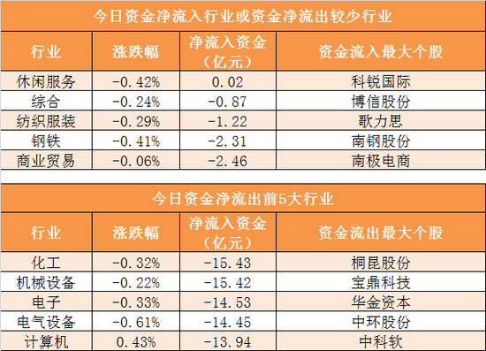 28个申万一级行业中,仅休闲服务1个行业实现资金净流入,化工、机械设备、电子、电气设备等行业净流出规模居前,其中化工行业净流出15.43亿元居首。