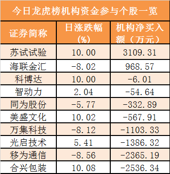 盘后龙虎榜数据显示,机构现身10股,其中苏试试验(26.950, 2.45,10.00%)等2股呈现机构资金净买入,合兴包装(4.260, 0.39, 10.08%)等8股呈现机构资金净卖出。
