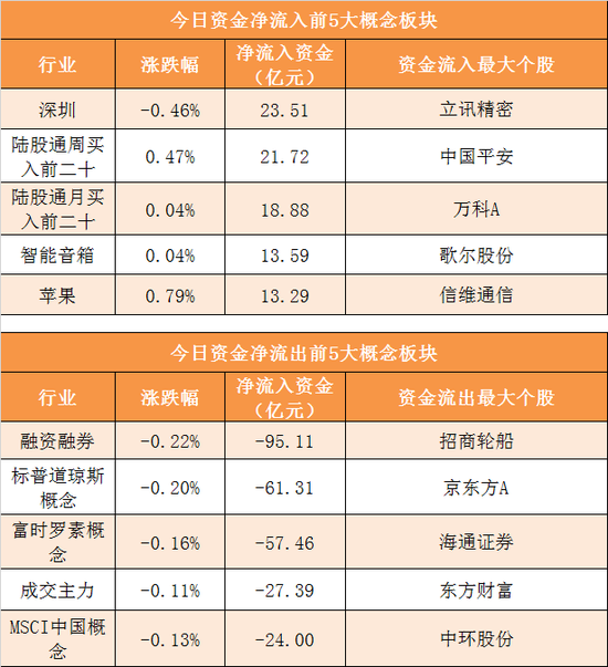 概念板块方面,今日深圳、陆股通周买入前二十、陆股通月买入前二十、智能音箱等概念板块资金呈现净流入,其中深圳概念净流入23.51亿元居首。