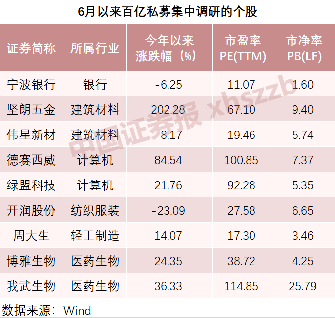 6月份,机构投资者依然勤奋,调研活动密集。高毅、星石、拾贝等明星私募纷纷到访,宁波银行备受青睐。而获百亿私募调研次数仅次于宁波银行的坚朗五金,今年来已收获了202.28%的涨幅。