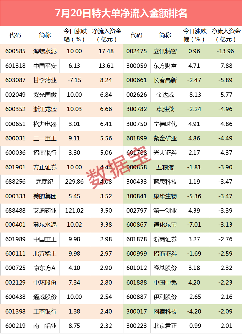 个股方面,大单资金净流入超亿元个股有65只。海螺水泥大单资金流入居首,净流入17.48亿元,股价涨停。水泥股今日崛起,四川金顶、万年青、冀东水泥等多股涨停。消息面上,业内人士透露,上半年水泥行业利润预计达800亿元左右,同比基本持平,预计今年水泥行业全年利润总额与去年基本持平,保持在1800亿元左右。资金面上,冀东水泥流入超3亿元,华新水泥流入1.5亿元,祁连山、塔牌集团、天山股份、上峰水泥等流入超6000万元。