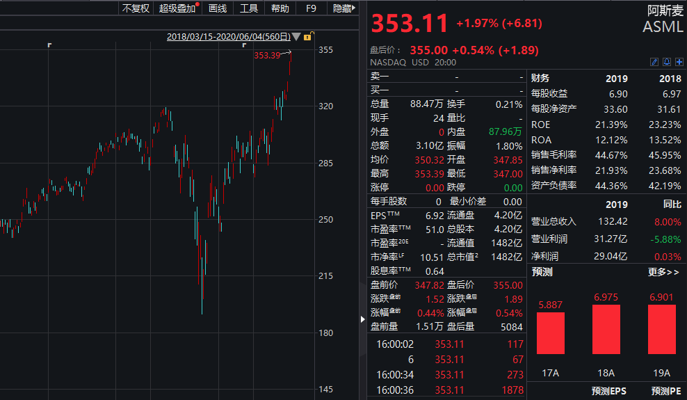 荷兰阿斯麦(ASML)是全球唯一一家高端光刻机制造商,每年仅出20台左右高端设备,每一台都被台积电和三星等大型芯片代工厂抢破了头。该公司日前已经推出了一种全新的半导体技术第一代HMI多光束检测机,可用于5nm及更先进制程工艺,有望让5nm芯片产能暴涨600%。该股表现也非常好,近期股价频频创出历史新高,市值已突破万亿元大关。