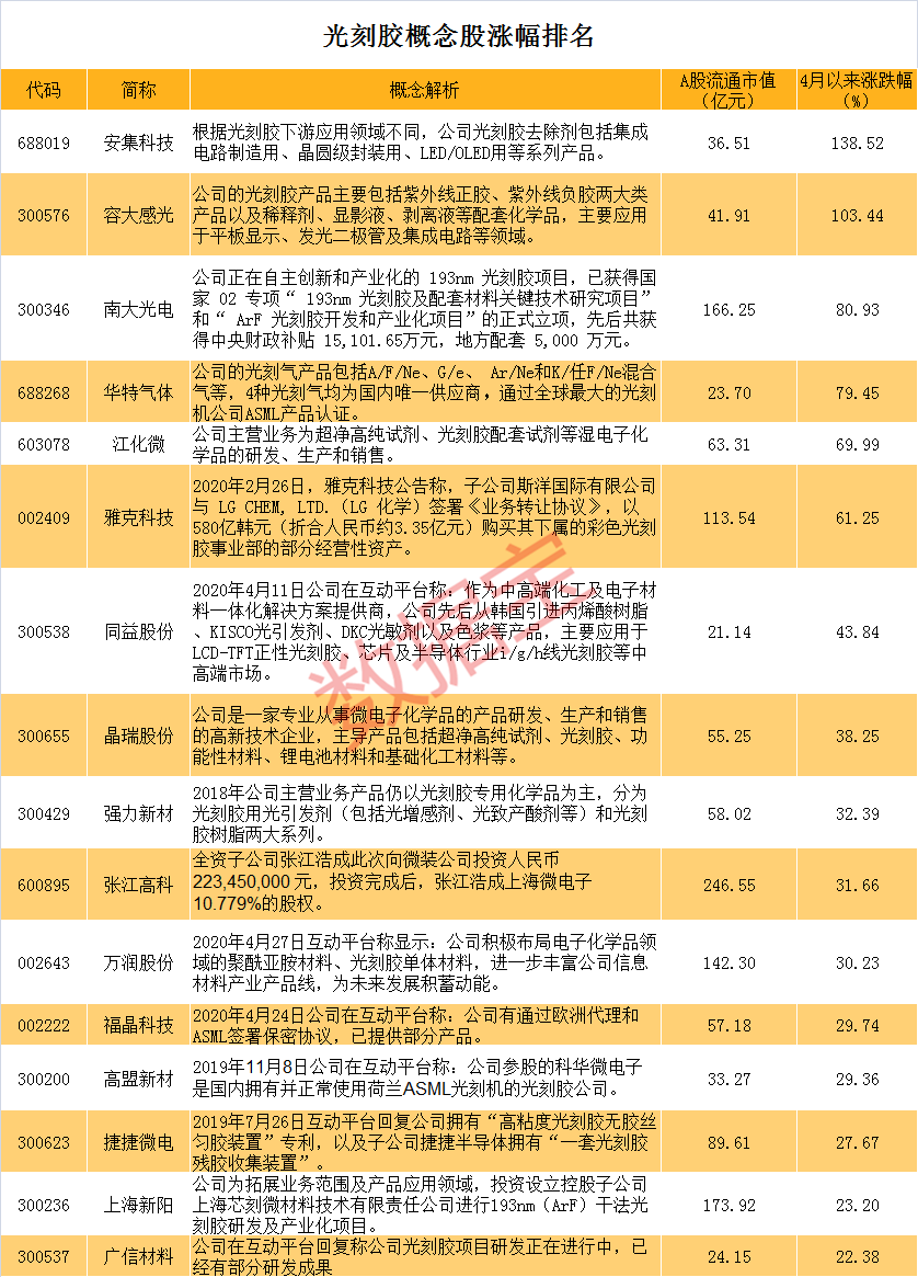 中国市场的半导体销售占了全球的三分之一,半导体进口替代需求迫切。A股市场上,相关的概念板块,光刻胶概念近期表现出色,4月以来累计涨幅接近45%,龙头股涨幅超过100%。