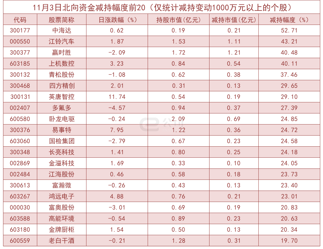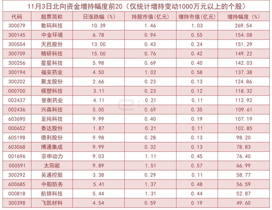 据e公司测算,增减持变动1000万元以上的个股中,数码科技、中金环境、天邑股份、精研科技等获北向资金大幅增持,分别为269.54%、154.08%、151.29%、149.22%。而中海达、江铃汽车、赢时胜、上机数控等减持幅度较大,分别减持52.71%、43.21%、40.48%、40.11%。