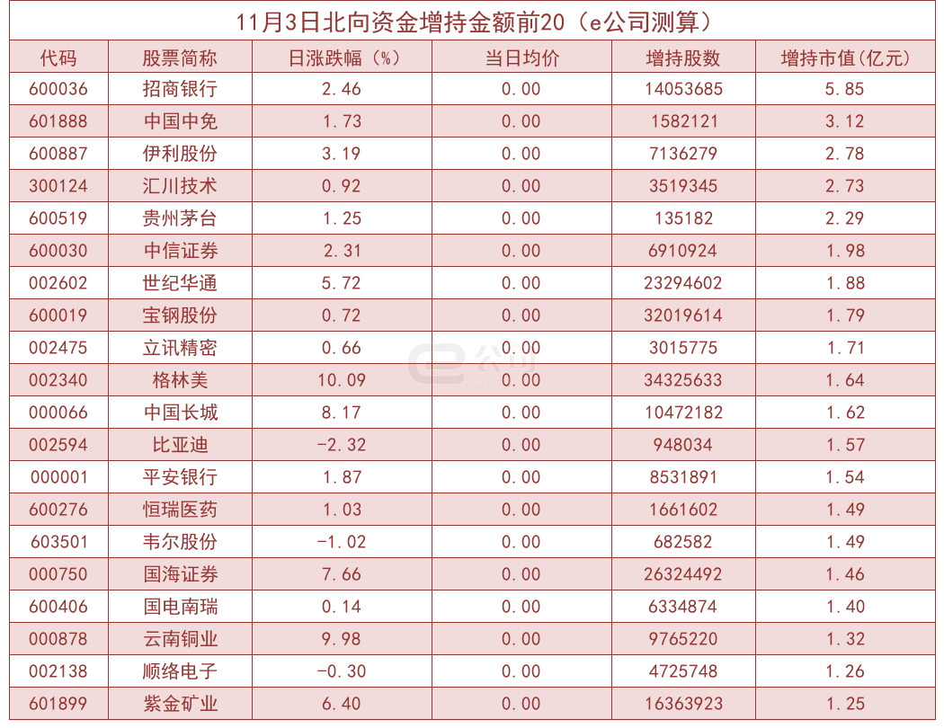 统计数据显示,11月3日北向资金合计净流入31.22亿元。其中沪股通净流入31.03亿元,深股通净流入0.19亿元。北向资金成交金额达到939.39亿元,占A股当日总成交金额比重为11.97%。