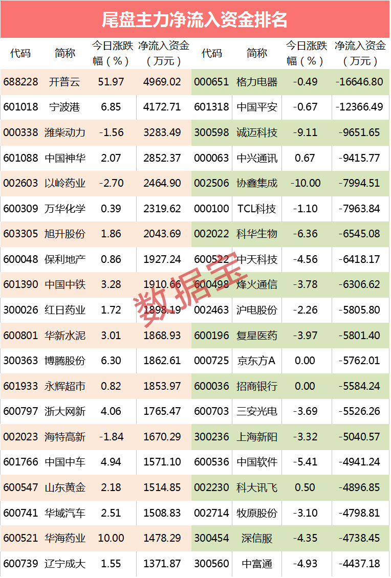 个股方面,尾盘资金没有一只个股流入超5000万元。流入最高的是开普云、宁波港,净流入均超4000万元,开普云是今日上市的科创板新股,宁波港尾盘小幅拉升,今日港口航运类个股全天走势稳健。潍柴动力尾盘流入超3000万元。