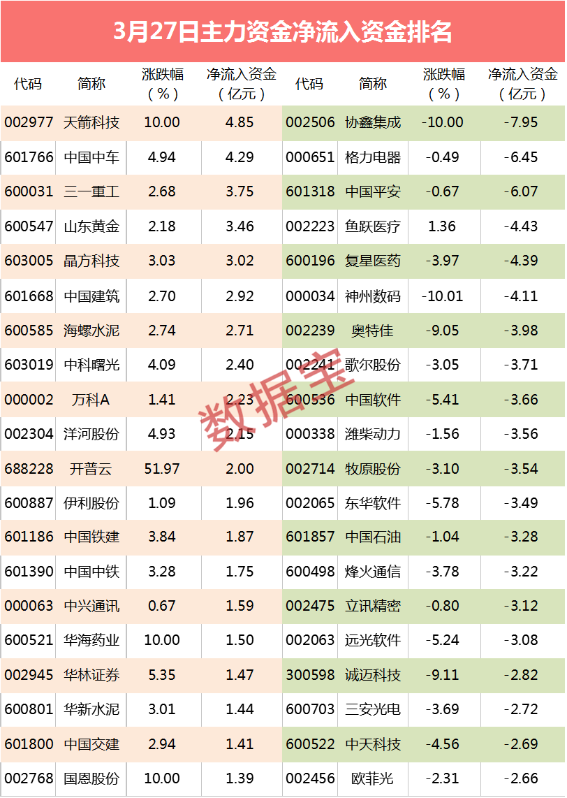 个股方面,主力资金流入超亿元的有27股,其中建筑装饰和机械设备各占4股。近期新上市次新股天箭科技今日首次开板,资金流入4.85亿元,流入居首。