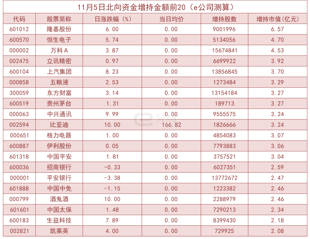 统计数据显示,11月5日北向资金合计净流入109.97亿元。其中沪股通净流入50.59亿元,深股通净流入59.38亿元。北向资金成交金额达到959.84亿元,占A股当日总成交金额比重为11.16%。