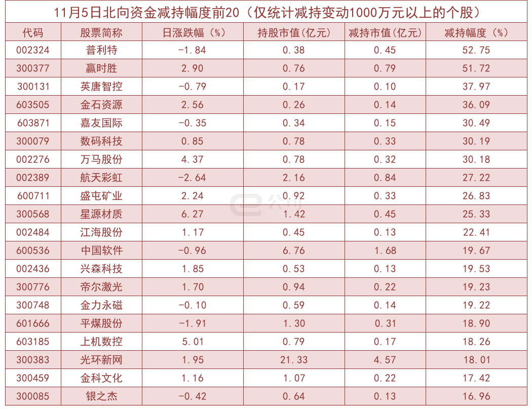 据e公司测算,增减持变动1000万元以上的个股中,鹏鹞环保、合纵科技、天音控股、三泰控股等获北向资金大幅增持,分别为837.14%、552.49%、71.53%、66.44%。而普利特、赢时胜、英唐智控、金石资源等减持幅度较大,分别减持52.75%、51.72%、37.97%、36.09%。