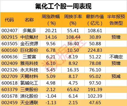 氟化工板块本周龙头为多氟多,周涨幅20.21%;而另一只氟化工概念股中欣氟材涨幅虽不及多氟多,但股价走势表现更为活跃,本周有两次涨停板,周涨幅14.16%。氟化工板块走强,一方面得益于氟化工上游原料萤石的涨价,生意社数据显示,最新萤石价格相比上月初上涨5.9%;另一方面受益于日韩贸易摩擦,日本对韩国限制出口氢氟酸,供应链替代关系利好国内的氟化工企业。