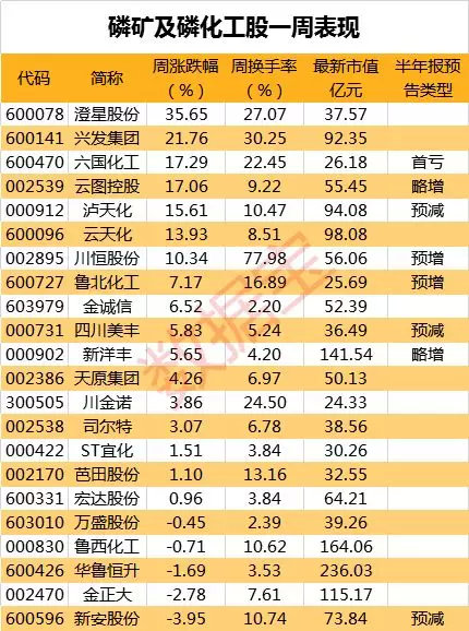 磷化工板块本周龙头是为澄星股份,一周连续三个涨停板,周涨幅35.6%;兴发集团表现也不俗,周涨幅21.8%。磷化工板块走强的主要原因为黄磷涨价,百川资讯价格显示,截至7月11日,黄磷价格周涨幅35.48%,磷酸周涨幅5.59%。